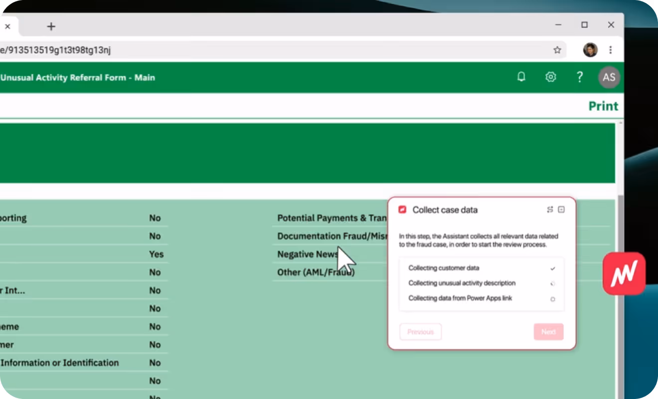 Associates investigate flagged transactions across a custom KYC system, Zendesk, Google Maps, and SharePoint. Foreign scripts need translation. SOPs change frequently. Each case: ~9 minutes, 142 actions.